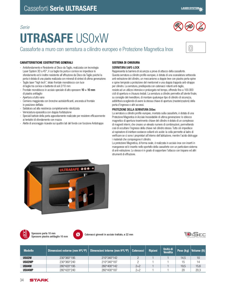una piastra di protezione aggiuntiva da 10 mm, fissata all’interno della cassaforte a copertura di tutta la serratura, realizzata con minerali di sintesi di ultima generazione e di elevata durezza, garantisce un’elevata resistenza all’attacco con il disco da taglio. La versione a mobile prevede le piastre antitaglio 10 mm su tutti i lati, eccetto sul fondo e sul lato posteriore della cassaforte. Questi lati sono dotati di pre-fori per il fissaggio con tasselli a pavimento e/o a muro.